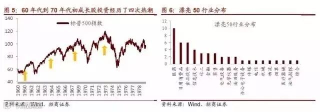 第一个热潮是技术股和电子狂潮。像德州仪器公司和摩托罗拉这样的与新技术联系的公司首先成为股市的宠儿;60年代中期,伴随着“联合企业”投资的狂热的来临,美国股市进入历史上第二次购并浪潮。上市公司通过建立“联合企业”所产生的所谓“协同效应”,人为制造利润成长,以此提高股票的价格。1968年,由于联邦贸易委员会和司法部对联合企业的合并调查以及收购会计制度的改变,这一热潮走向崩溃;60年代末期,又出现了概念股票投资热潮,机构投资者也纷纷加入“概念股票”的炒作。1969年至1971年的空头市场宣告了概念投资的终结,投资者吸取了概念投资的惨痛教训之后,逐渐开始转向价值投资,于是就迎来了70年代初的“漂亮50”成长投资浪潮。机构投资者不再追求激动人心的概念股票,而是选择那些能够长期稳健成长,基本面良好的知名公司的股票,通用电气、宝丽来、可口可乐、麦当劳等行业巨头构成的“最有吸引力的50只股票”在这一时期大幅上涨,驱动了20世纪70年代初的美国牛市。