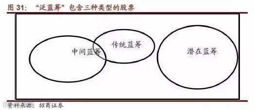 针对蓝筹与非蓝筹之间的转换问题,我们将蓝筹的概念作出了进一步的拓展,提出“泛蓝筹”概念。在我们看来,泛蓝筹包含三种类型的股票: