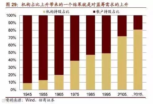 另一方面,美国市场投资者以机构投资者为主,尤其是60年代以后,保险公司、养老基金和共同基金等对资金有稳定以及长期收益需求的机构成为投资者的主力。因此,以蓝筹股为投资目标的投资者数量及其资本规模迅猛增长,蓝筹股在主流机构投资组合中的权重日益提高。在美国等成熟资本市场,蓝筹股是各大投资银行和基金公司的关注重心,大型资本机构很少离开蓝筹股来构建投资组合。