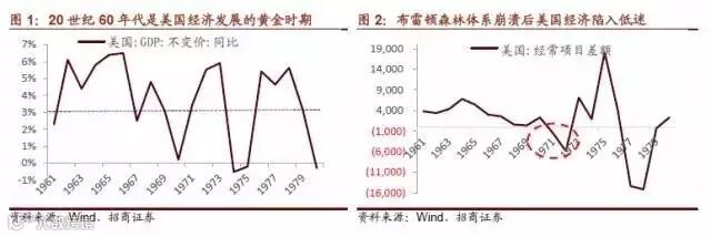 20世纪60年代是美国经济发展的黄金时期,1961年至1969年,美国经济持续增长。60年代后期,美国进一步扩大了侵越战争,国际收支进一步恶化,美元危机也再度爆发。1971年8月15日,尼克松政府宣布实行"新经济政策",停止履行外国政府或中央银行可用美元向美国兑换黄金的义务。1971年12月,以《史密森协定》为标志,美元对黄金贬值,美联储拒绝向国外中央银行出售黄金。至此,美元与黄金挂钩的体制名存实亡,布雷顿森林体系崩溃。美国经济陷入低迷,物价水平较低。