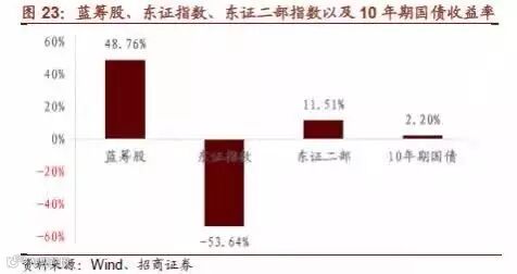 整体看来,利率债市场因低利率的货币政策,收益率长期处于低位,且去年3月,日本10年期国债收益率已为负值。而在处于日本萧条期的股票市场中,蓝筹股收益可观。从1990年至今蓝筹股绝对收益高达48.76%,同期东证指数收益率仅为-53.64%。虽然2002年后兴起小盘股,东证二部指数在经济低迷时期的收益率也仅有11.51%,不及稳健的蓝筹股。