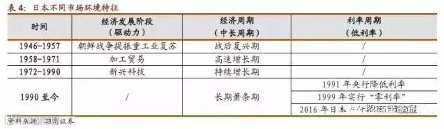 日本经济环境的划分相对简单,转折点是1990年房地产泡沫破灭。此前,日本经济经历“复兴-高速增长-持续增长”阶段,泡沫破灭后日本经济持续低迷,长期萧条。
