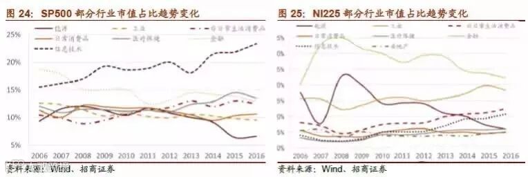 (2)在不同经济体下,蓝筹股成分的变迁较为明显地体现出产业结构均衡化的特征。海外蓝筹的历史变迁大体能反映产业变迁,蓝筹股代表的是当期国民经济的支柱型产业。在不同时代,蓝筹驱动力是有所不同的,例如日本80年代初,宏观经济高速增长时期,蓝筹股的上涨是以投资驱动为主,而到了80年代末、90年代初,宏观经济增速见顶后以消费驱动型蓝筹为主。整体来看,成分的变迁较为明显地体现出产业结构均衡化的特征。