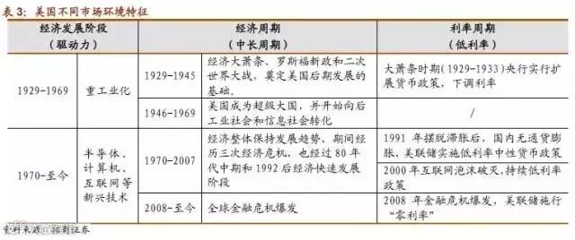 参照前文,20世纪70年以后,美国主要经历了两个中长期的经济周期,分别是1970年-2007年的平稳发展时期,和2008年至今的全球金融危机爆发后的阶段。这期间包含3个主要利率周期,分别是1991年-1994年美联储在无通货膨胀的宏观环境下维持的中性货币政策时期,2001年-2004年应对互联网泡沫破灭的低利率时期,2008年金融危机后采取的零利率时期。