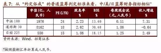 大市值、低估值、高股息、高roe、收入稳定、现金流充沛这六大特征满足其中的部分特征就可成为“约定俗成”的蓝筹股。选取能够反映公司优良业绩和市场表现的指标,是确切定义蓝筹的第一步。我们将美国、日本、中国市场中所共识的蓝筹股列出,并展示了其是否具备以上的特征(这里只列出一个均值表)。