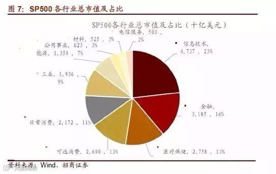 根据最新的数据,在标普500成分股总市值中占比排名前七的行业分别是信息技术、金融、医疗保健、非核心消费品、工业、核心消费和能源,而它们在总市值中的占比之和长期维持在90%左右。尽管经历了21世纪初“互联网泡沫”的破裂,美股的核心板块仍然是信息技术产业,其权重逐年上移,目前在23%左右;而金融板块一度在2007年初(次贷危机前夕)占比达到22.3%的峰值,不过随后在金融危机中落回9.8%的低谷(2009年2月),近年来逐渐恢复企稳。上游的能源板块的权重变动呈现显著顺周期性,08年以后其权重一度乘着大宗商品价格浮涨来到16%的峰值,不过近年来能源价格几乎跌回到06年水平,其权重也随之一路下滑到7%;在美股本轮牛市中异军突起的是医疗保健板块,其权重从2011年3月至今上升了约3%。