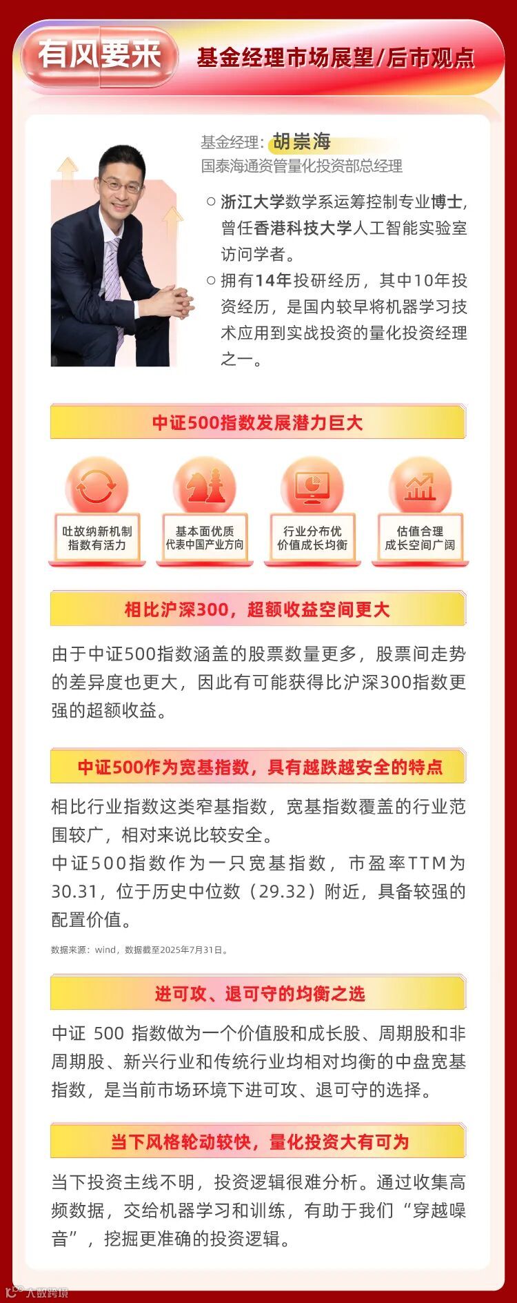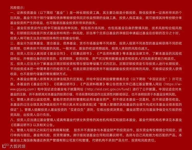 市场有风险,投资需谨慎。国泰海通资管承诺以恪尽职守、诚实信用、谨慎勤勉的原则管理和运用产品资产,但不保证一定盈利,也不保证最低收益。国泰海通资管旗下产品的过往业绩不构成对产品未来业绩表现的保证。投资者在进行投资前应当认真阅读产品合同、招募说明书、产品资料概要等信息披露文件,自主做出投资决策,自行承担投资风险。