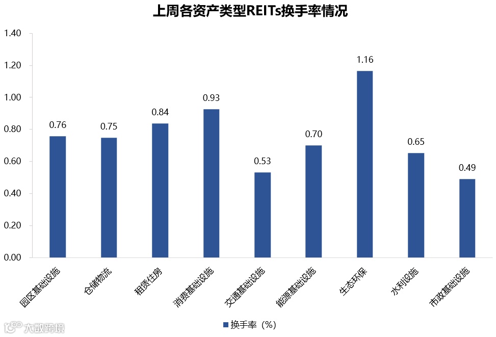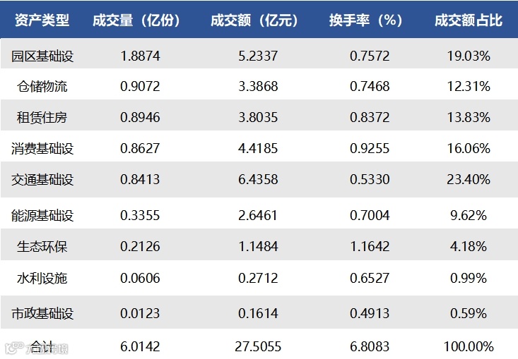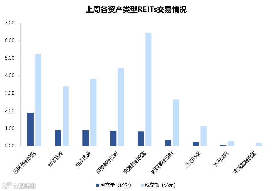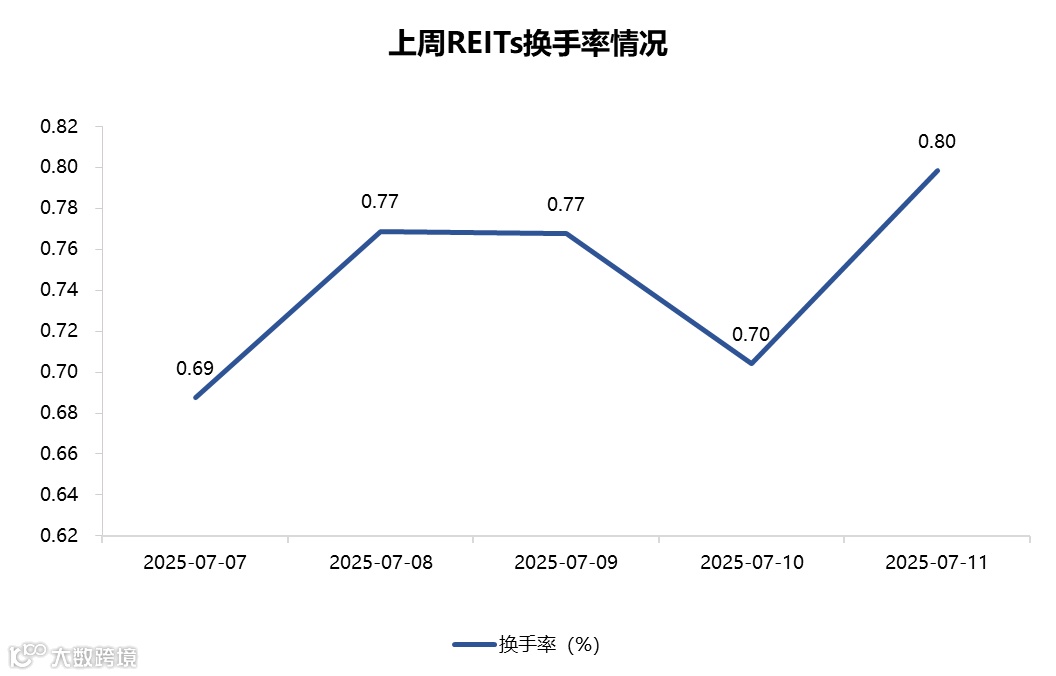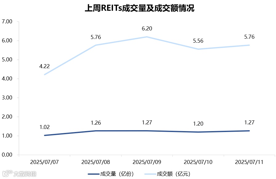 2025年7月7日至2025年7月11日,合计成交量6.0142亿份,成交额27.5055亿元,区间换手率0.7453 %。各资产类型方面,本周园区基础设施REITs成交量最高,共计1.8874亿份;市政基础设施REIT成交量最低,共计0.0123亿份。另外在成交额占REITs总成交额比重中,交通基础设施REIT(23.40%)排名较高,市政基础设施REITs(0.59%)排名较低。