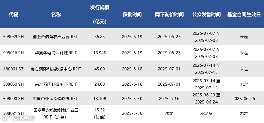 截至7月11日已获批待上市REITs共有6只(含扩募),情况如下表所示: