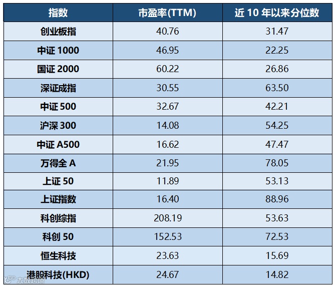 备注:科创50、中证1000、国证2000、科创综指市盈率(TTM)为指数发布以来的分位数