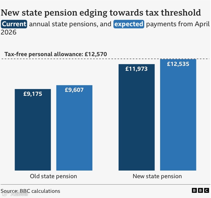 184.75英镑,折合每年9,607英镑,比目前增加431.60英镑。英国约有1,300万人领取国家养老金。养老金咨询公司LCP合伙人、前养老金部长史蒂夫·韦布爵士指出,到2027年,仅依靠新国家养老金生活的人将首次被纳入纳税人行列。“目前,已有近四分之三的退休人员需缴纳所得税,随着免税额冻结和养老金持续上涨,更多老人将进入纳税范围。”