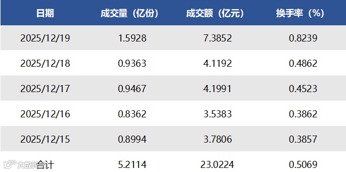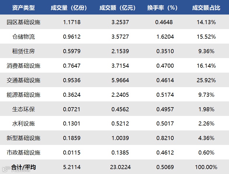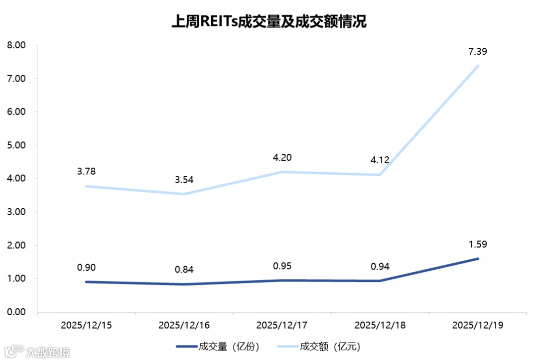 2025年12月15日至2025年12月19日,合计成交量5.2114亿份,成交额23.0224亿元,区间换手率0.5069%。各资产类型方面,上周园区基础设施REITs成交量最高,共计1.1718亿份;市政基础设施REIT成交量最低,共计0.0115亿份。另外在成交额占REITs总成交额比重中,交通基础设施REITs(25.92%)排名较高,市政基础设施REITs(0.60%)排名较低。