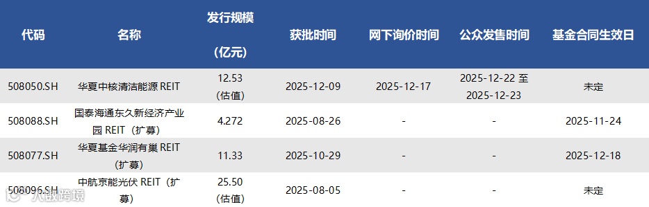 截至12月19日,已获批待上市REITs共有4只(含扩募3只),情况如下表所示: