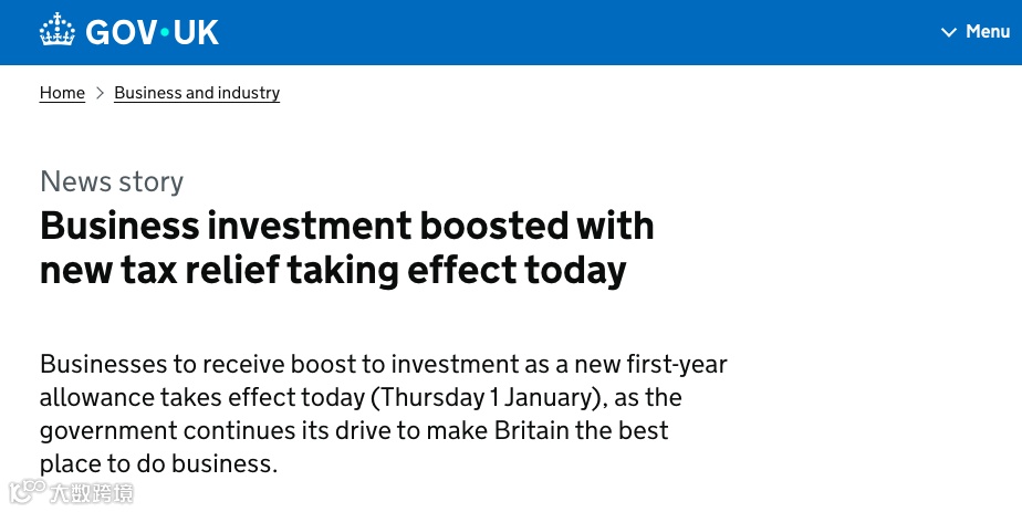 英国一项新的首年抵免政策于2026年1月1日正式生效——针对企业符合条件的厂房和机器设备可享受永久性40%首年抵免(FYA)。这一政策标志着英国在改善商业和投资环境方面又迈出了重要一步。