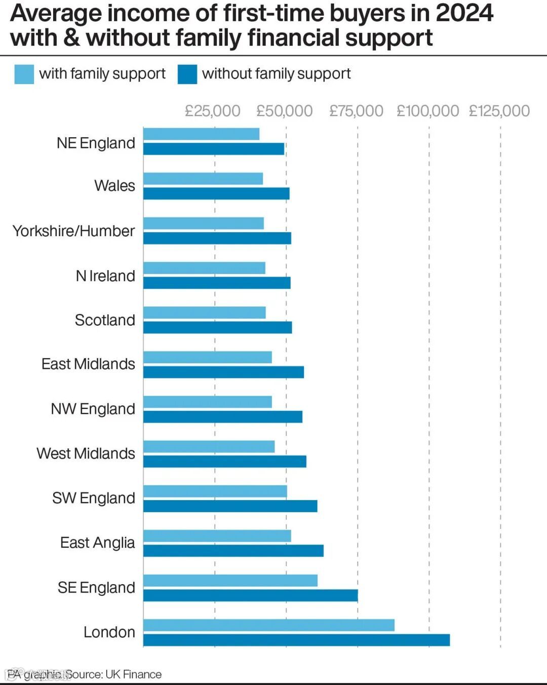 接受家庭资助的购房者平均支付的首付为118,073英镑,而未获资助的首次购房者平均支付的首付为60,741英镑。差距足足达到6w!!