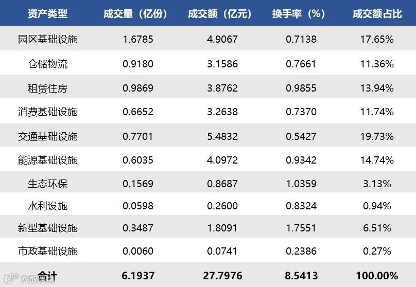 2025年9月1日至2025年9月5日,合计成交量6.1937亿份,成交额27.7976亿元,区间换手率0.7797%。各资产类型方面,上周园区基础设施REITs成交量最高,共计1.6785亿份;市政基础设施REIT成交量最低,共计0.0060亿份。另外在成交额占REITs总成交额比重中,交通基础设施REITs(17.65%)排名较高,市政基础设施REITs(0.27%)排名较低。