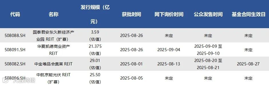 截至9月5日已获批待上市REITs共有4只(含扩募2只),情况如下表所示: