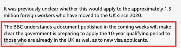此前尚不清楚此规定是否适用于自2020年以来已迁居英国的大约150万名外国劳工。但据英媒了解,未来几周将公布的一份文件将明确指出:政府准备将10年的资格门槛适用于已经在英的移民,而不仅仅是新签证申请者。