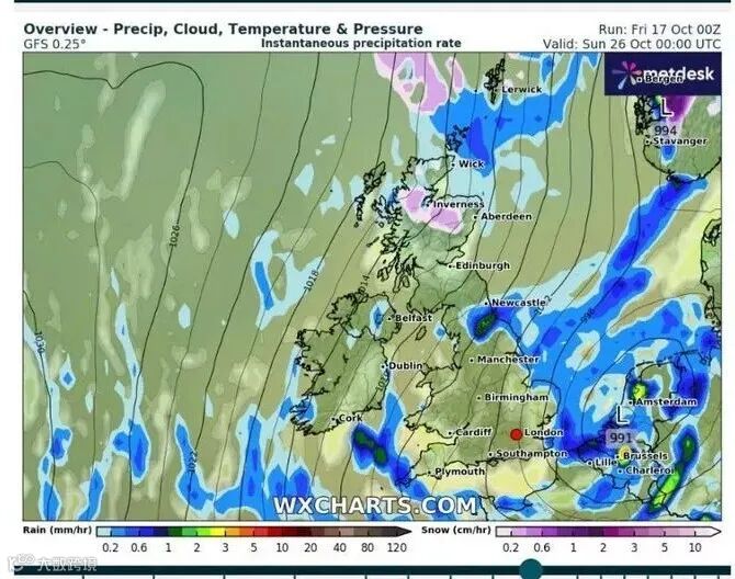 根据WX Charts最新气象图,本周全英笼罩在降雨天气中。预计从10月26日(周日)起,白雪将率先覆盖Inverness及苏格兰高地(Scottish Highlands)一带。每小时可能降雪0.厘米,将持续至当日晚间6时。