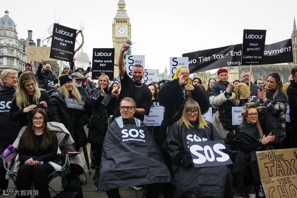 3月17日(周一),代表美容美发行业的抗议者身穿黑色剪发罩衣和工作制服聚集在议会广场,许多人坐在折叠椅上,一边接受美发和美容护理,一边高喊示威口号。要求在春季预算声明中,将劳动成本的增值税从20%降至10%。