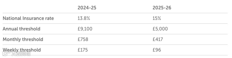 从2025年4月6日起,雇主国民保险(NIC)的税率将从13.8%提高至15%。此外,雇主为员工薪资支付NIC的起征门槛将从9,100英镑下降至5,000英镑。