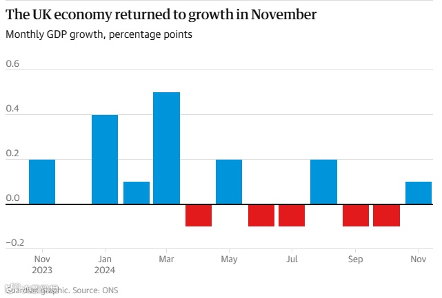 另外,英国经济11月仅增长0.1%,低于预期,但该趋势也减轻了财政大臣里夫斯在上个月经济萎缩后面临的一些压力。她承认,英国经济复苏需要时间。