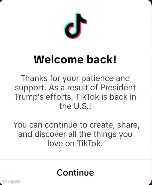 随后,TikTok在其社交媒体上更新了停止运营的通知,写道:“我们很幸运,特朗普总统表示,他将与我们合作,找到解决方案,以便在他上任后恢复TikTok”。