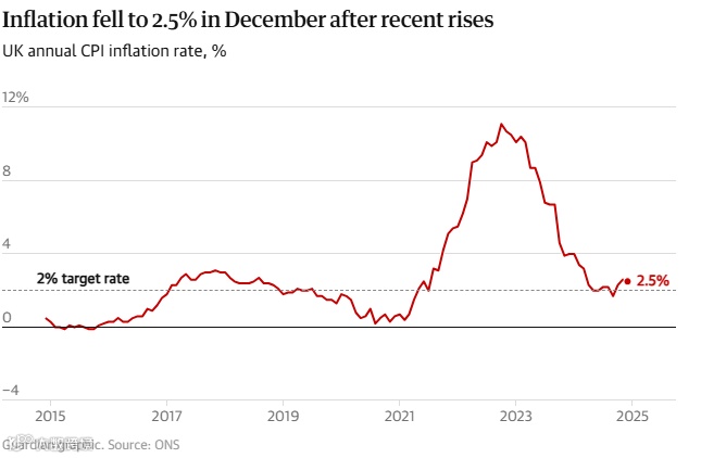 国家统计局的数据显示,英国通胀率12月降至2.5%,低于11月的2.6%,意味着物价上涨速度放缓。同时提高了英国央行下个月降息的可能性。