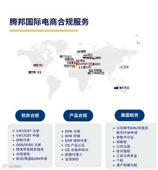 不仅帮助您简化各国的复杂增值税规则,提供包括英国、欧盟、美国、日本、澳大利亚、阿联酋、加拿大、墨西哥在内的超过20个国家的增值税注册与申报,EPR注册与申报、欧盟代理人、CE产品认证和商标注册等业务,还为您及时更新不同国家和地区的税务政策,确保税务合规。