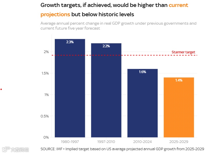 同时,这意味着经济增长将比目前的水平更快(保守党执政期间,2010年至2024年平均增长率为1.6%),并要超过目前对未来五年年增长率的预测(1.4%)。
