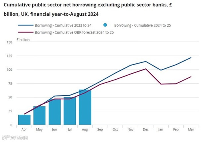 国家统计局(ONS)初步估计,英国公共部门债务自1960年代以来,首次达到该国年度经济产出GDP的100%。数据显示,政府8月份借款137亿英镑,使得本财年的借款额已达641亿英镑,比预算责任办公室(OBR)预测的高出60亿。