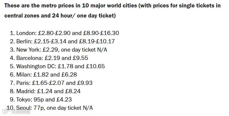 在《电讯报》对全球十大地铁系统费用进行统计后发现,尽管每个地铁系统都使用不同的定价结构,但从单程票价来看,伦敦已经成为“世界最贵公共交通系统”。