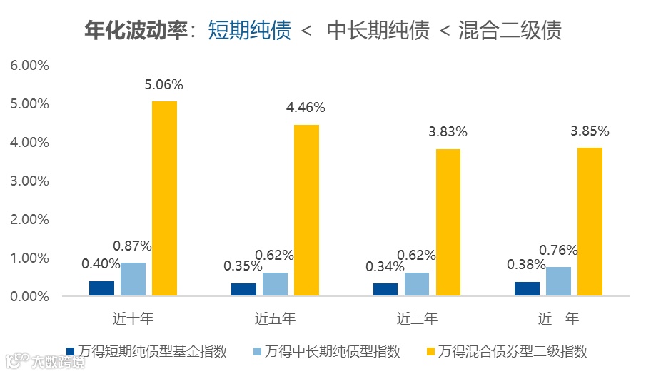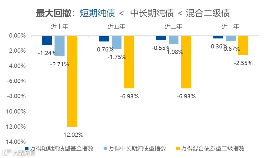 截至2024年末,万得短期纯债型基金指数近10年波动率仅0.40%,最大回撤-1.24%,波动率与回撤均小于万得中长期纯债型指数和万得混合债券型二级指数。