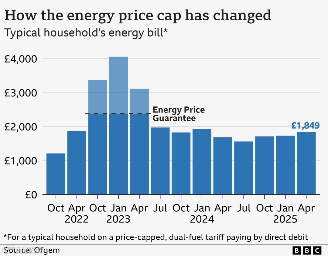 2025年1月1日,能源价格上限上涨约1%,达到1,738英镑/年。该上限每三个月调整一次,适用于标准或默认浮动费率,并通过直接扣款(direct debit)支付。对于预付费用户(prepayment)及其他支付方式的家庭来说,上限价格可能略有不同。