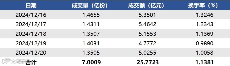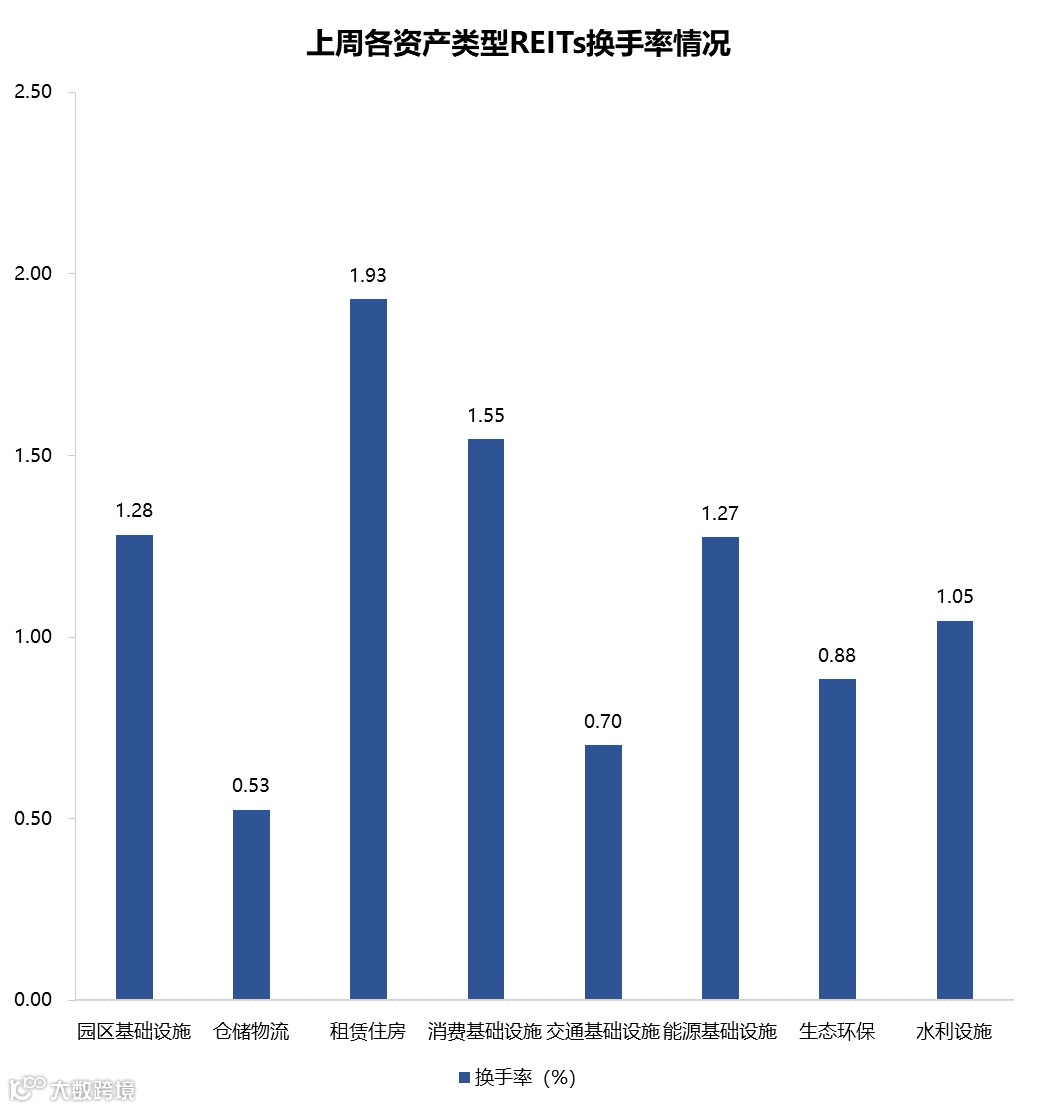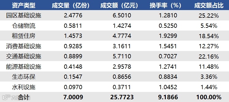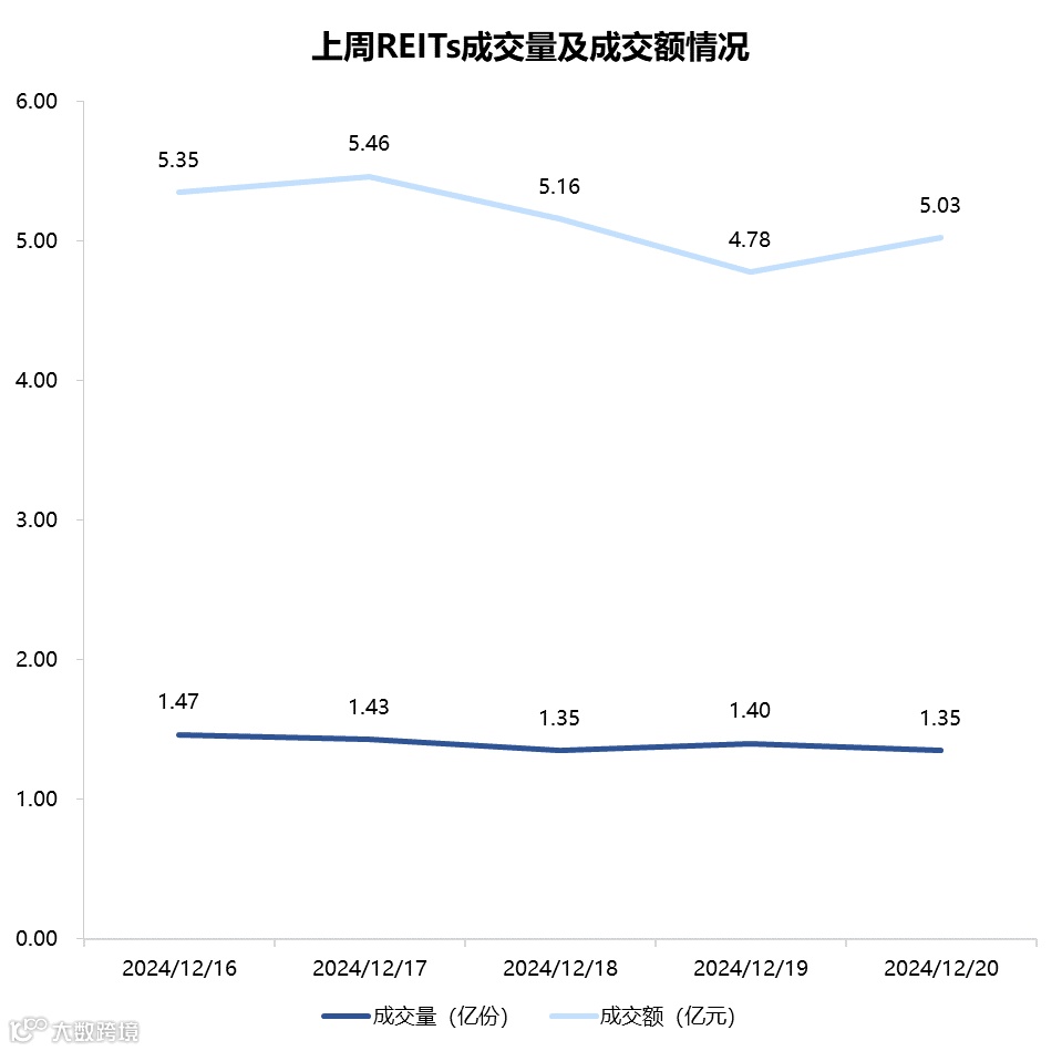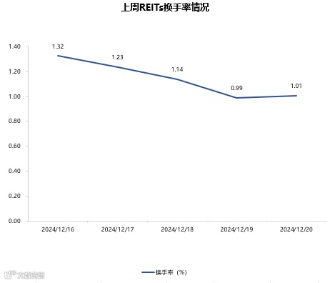 2024年12月16日至2024年12月20日,合计成交量7.0009亿份,成交额25.7723亿元,区间换手率1.1381。各资产类型方面,上周园区基础设施REITs成交量最高,共计2.4776亿份;水利设施REITs成交量最低,共计0.0970亿份。另外在成交额占REITs总成交额比重中,园区基础设施REITs(25.22%)排名较高,水利基础设施REITs(1.44%)排名较低。