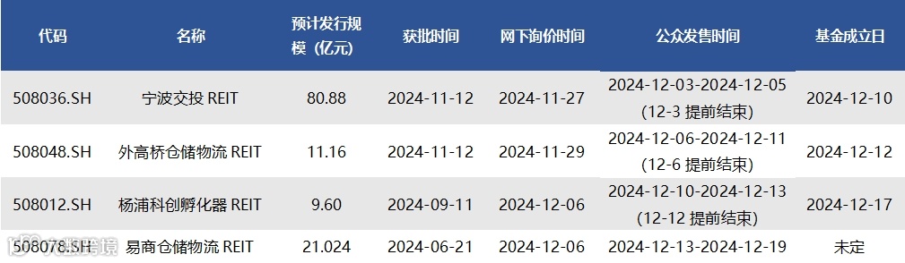 截至12月20日,已获批待上市REITs共有4只,情况如下表所示: