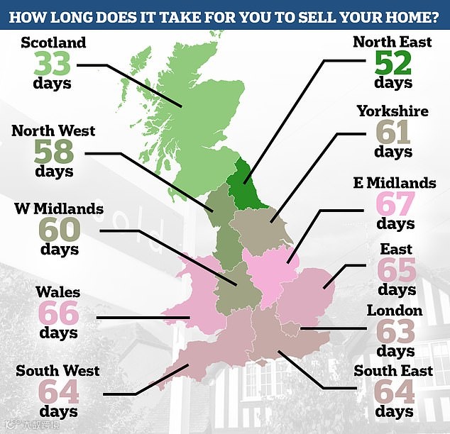 Rightmove 说,从不同的区域来看,苏格兰的房地产市场相当火爆,苏格兰的卖家平均需要花33天就能找到买家了,比英格兰和威尔士的房产卖得更快一些。相反,英格兰的东米德兰兹地区(The East Midlands)是销售最慢的地区,平均房屋需要 67 天才能出价。