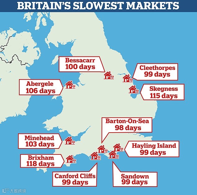 Rightmove 的数据显示,除伦敦以外,十个房产销售最慢的市场有9个都是沿海城镇。比如说,德文郡沿海小镇布里克瑟姆(Brigham),当地卖家平均需要 118 天才能找到买家。在今年前半年,当地的水污染影响了供水系统,该城镇成为了人们关注的焦点,许多买家不敢在那里买房。另外一个难卖房的地方在林肯郡的斯凯格内斯(Skegness),卖家平均要等待 115 天才能找到买家;而在怀特岛的桑当(Sandown),他们要等待 109 天。