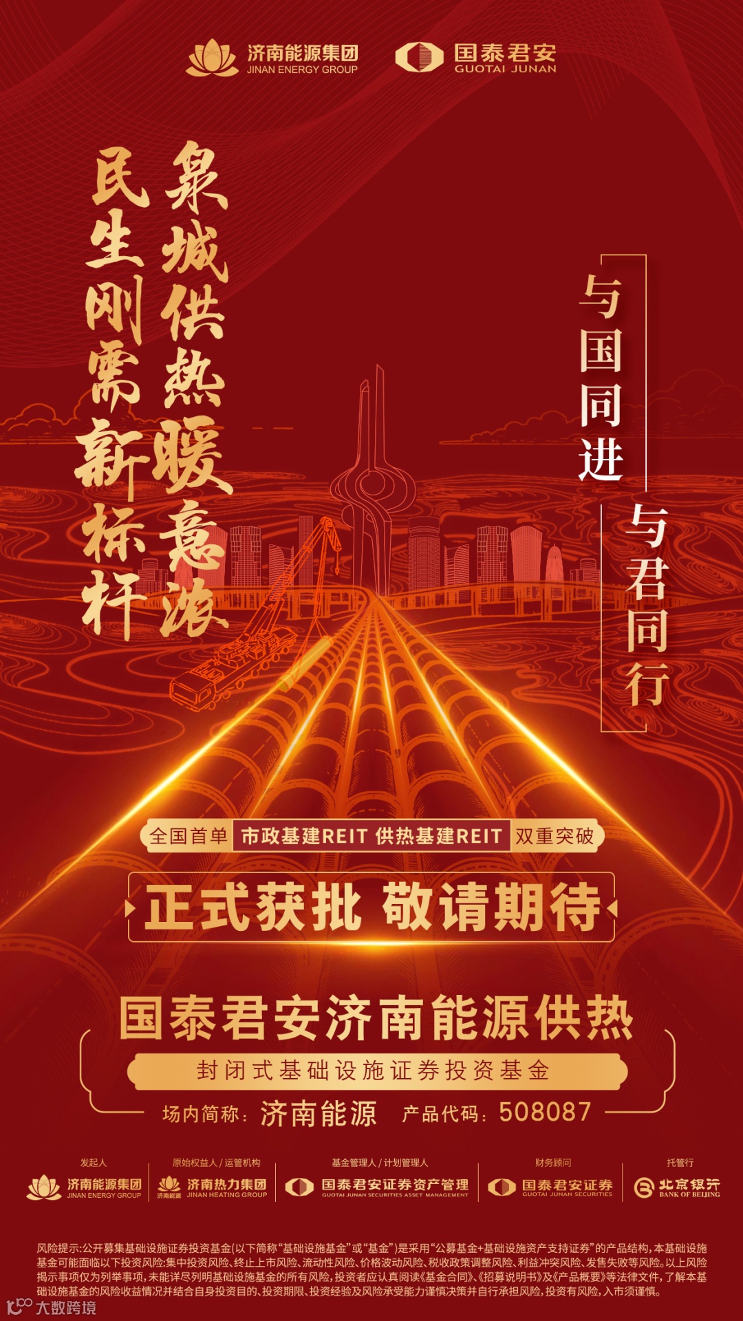 12月25日,由国泰君安证券担任财务顾问、国泰君安资管作为基金管理人和计划管理人的国泰君安济南能源供热封闭式基础设施证券投资基金(简称“国泰君安济南能源供热REIT”或“本项目”)获中国证监会准予注册的批复,并已于近期取得上交所无异议函。本项目是全国首单市政基础设施公募REITs,也是全国首单供热基础设施公募REITs,进一步开拓创新公募REITs大类资产类型,为投资人提供资产优质、收益稳定的创新产品,对公募REITs市场具有重要意义。