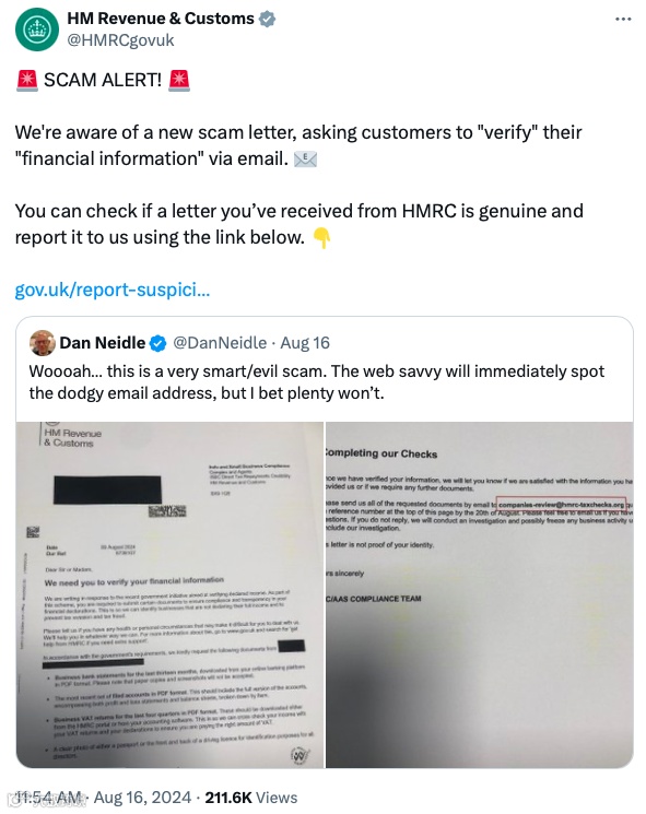 近日,英国一家名为Azets的会计师事务所在社交媒体发帖称,一些企业收到了冒充英国税务海关总署税务局(下文统称HMRC)的诈骗信。