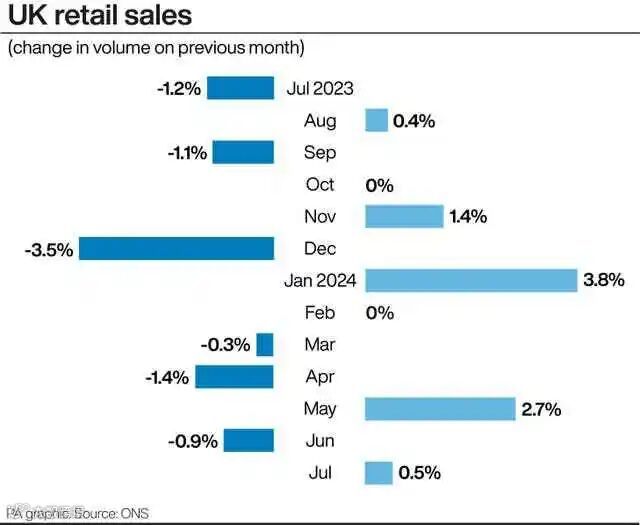 根据国家统计局 (ONS) 的数据,英国零售额7月份小幅上涨0.5%。尽管略低于经济学家预期的0.6%增长,但仍扭转了前一个月的暴跌趋势。