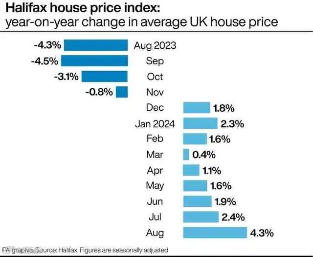 根据建筑房屋互助协会Halifax的最新数据,8月份英国平均房价创下两年来新高,较上月上涨0.3%,达到2022年11月以来的最高涨幅。