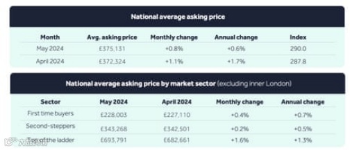 英国房地产市场的春季销售季节正在加速,房屋要价已升至创纪录的水平。根据在线房地产门户网站Rightmove今天上午的报告,过去一个月内市场上出售房产的平均价格达到375,131英镑,比4月份上涨了0.8%。尽管如此,平均要价仅比去年同期高出0.6%。