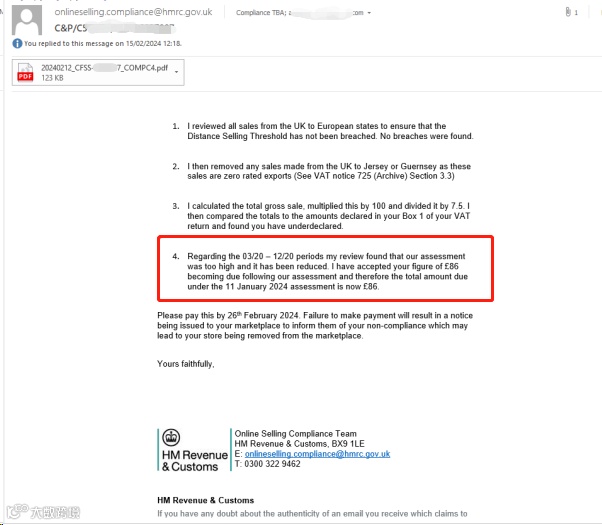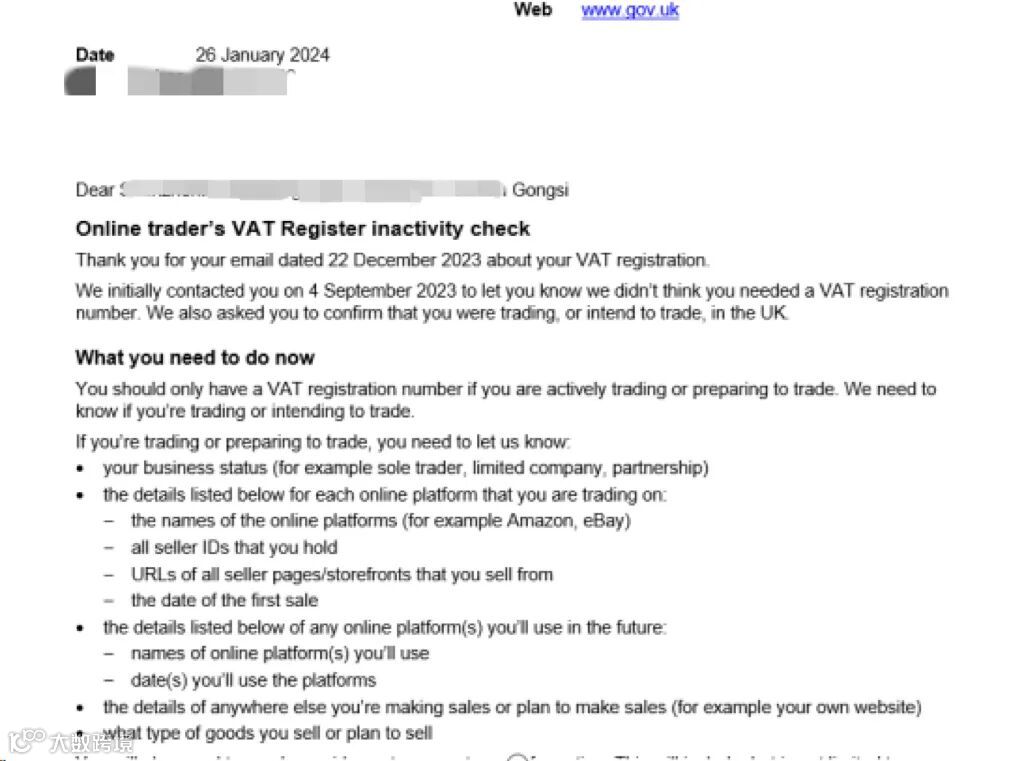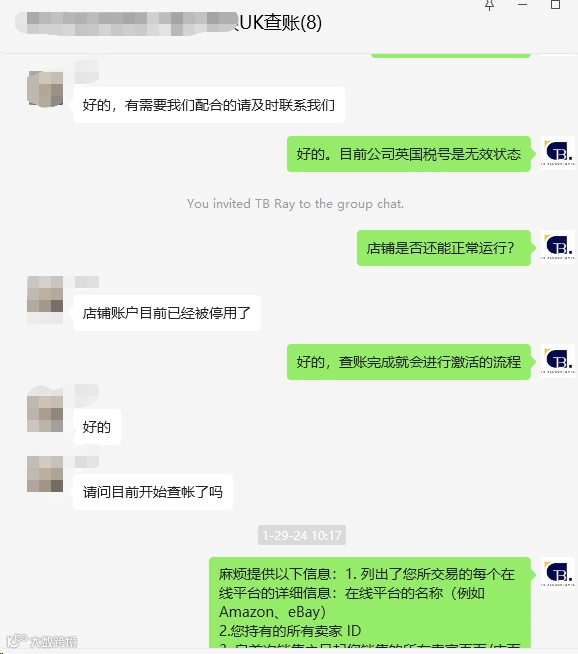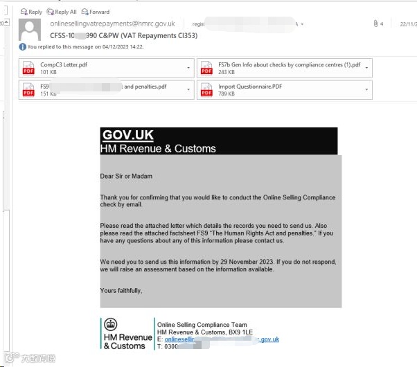 1月26号,客户收到英国税局邮件,邮件显示客户的英国税号被税局注销,相关的亚马逊店铺已经被冻结,无法正常运营。原因是客户没有及时回复税局的查账信~