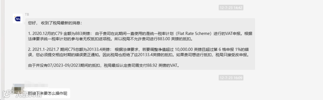 M先生在2024年1月11日收到英国税局信件,信件显示,因为他的营业额超过了低税标准(VAT),所以已被移出低税率的范畴,需要按照20%的标准税率缴税,同时要求他支付37,810英镑税金,和5,105.47英镑罚金。