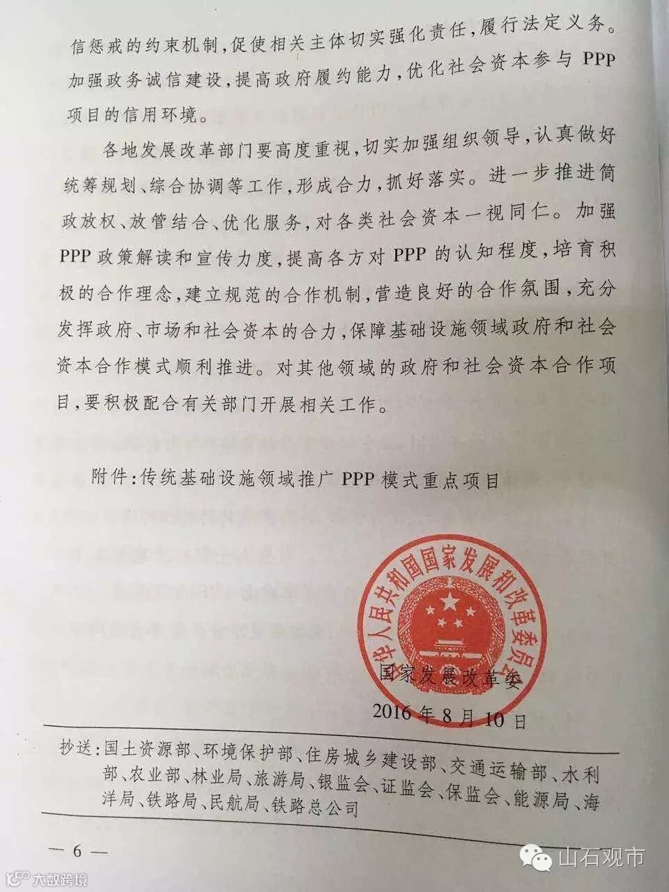 近日,为在传统基础设施推广PPP模式重点项目,国家发改委向全国各省级发改委下发文件,并一并向:国土资源部、环保部、住建部、交通运输部、水利部、农业部、林业局、旅游局、银监会、证监会、保监会、能源局、海洋局、铁路局、民航局、铁路总公司等16部委抄送。
