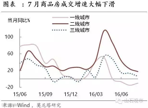 莫尼塔宏观研究主管钟正生,提供了一组数据:1-7月,房地产开发投资累计增速为5.3%,连续第3个月下跌;从单月增速看,7月房地产开发投资同比上涨1.4%,较6月的3.5%再次大幅下滑,接近2月份的年内低点;地产投资持续下滑受到房地产销量下行的拉动;7月30个大中城市商品房成交面积同比仅上涨8.7%,较6月下跌4.5个百分点,该增速也创下2015年3月以来的最低水平;7月新开工面积累计增速继续下滑至13.7%,为年内最低水平。