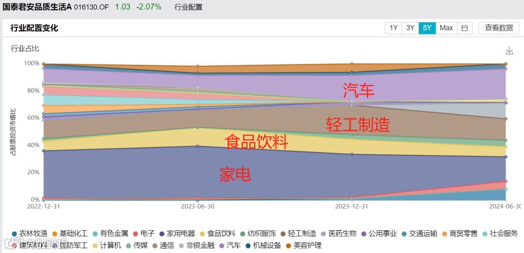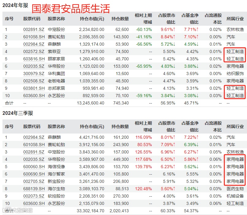 “国泰君安品质生活”的重仓行业集中在家电、汽车、轻工制造等“制造消费”上,这是他基于“均值回归”做出的选择。