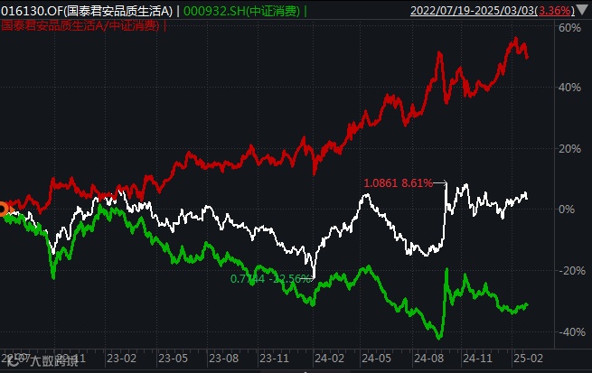 白线是这只基金的走势,绿线是中证消费,红线是基金相对中证消费的超额收益。