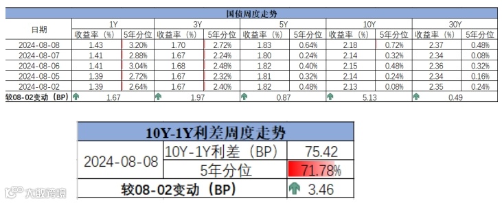 截至8月8日,国债收益率短端上行,长端上行,曲线走陡,10Y-1Y利差为75.42,较8月2日上行3.46BP,处于近5年71.78%的历史分位。